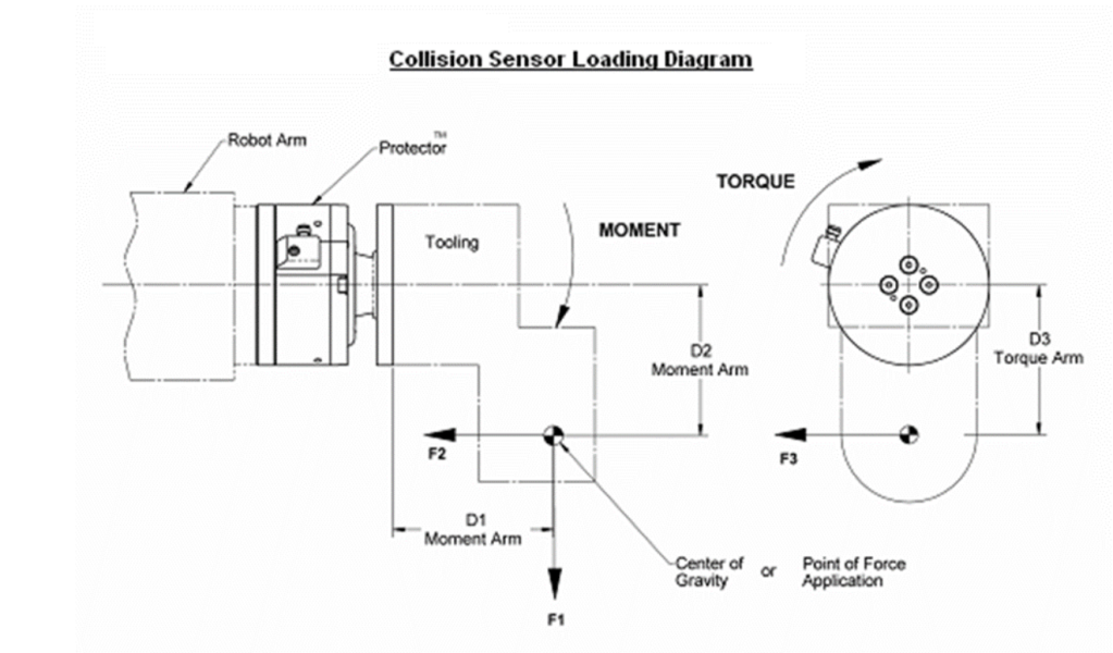 可以使用图 1 将作用在末端执行器工具上的力转换为施加到保护器上的力矩、扭矩和轴向载荷。使用图 1 中的示意图和下面的公式计算应用中的最坏应用负载。应评估所有三种负载情况–轴向、扭矩和力矩–的静态、动态和工作力分量。